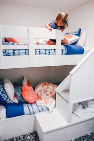 Adjacent to the room you will find a junior bunkbed, with bright bedding and linen with patterns and pillows by Ivory Ella, the girls loved it! Off to the side is the bathroom with a big soaking tub, subway tiles.The girls were in heaven!! I can't even describe their excitement!